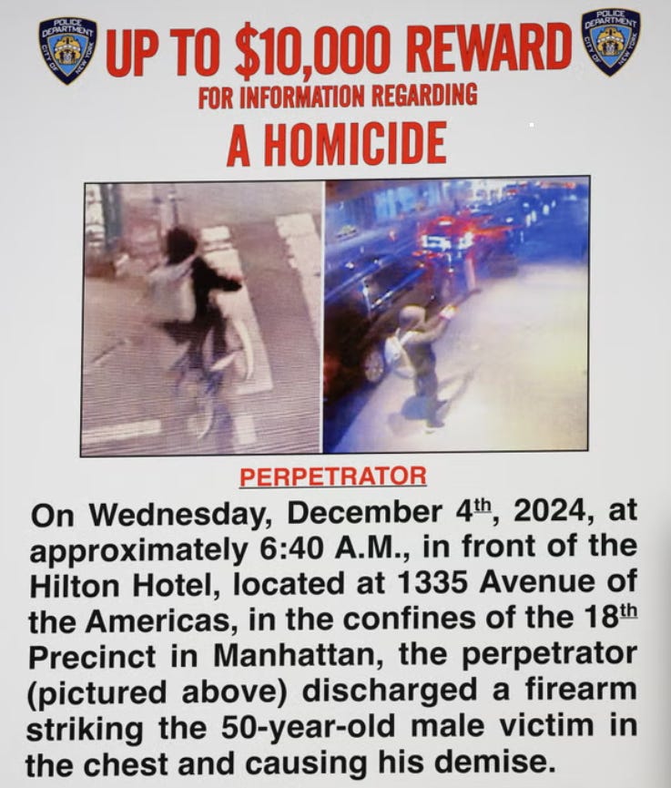 Since December 4th when United Healthcare CEO Brian Thompson was shot dead in midtown Manhattan, a continual panorama of news coverage has filled our devices and our minds. The spectacle includes hordes of police ploughing through Central Park, surveillance images captured from an Upper West Side hostel, the Port Authority bus terminal and multiple other NYC locations. There are revelations of a water bottle with a smudged fingerprint, a granola bar wrapper, a found backpack. Commentators analyze the killer’s shooting stance, ability to clear his weapon, distance from the victim, type of gun. The FBI is participating in the investigation and has upped the reward for information to $50,000 while the Atlanta police is now involved. That’s a lot of resources for one murder investigation.